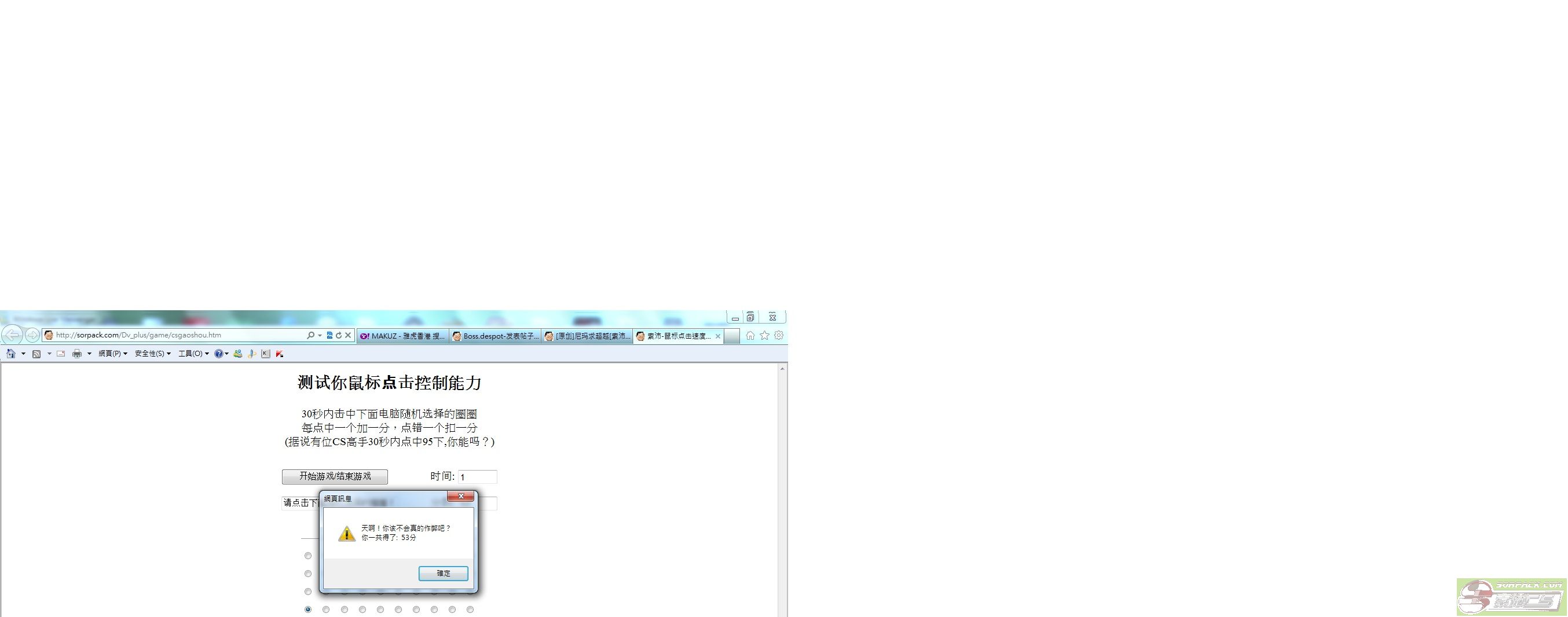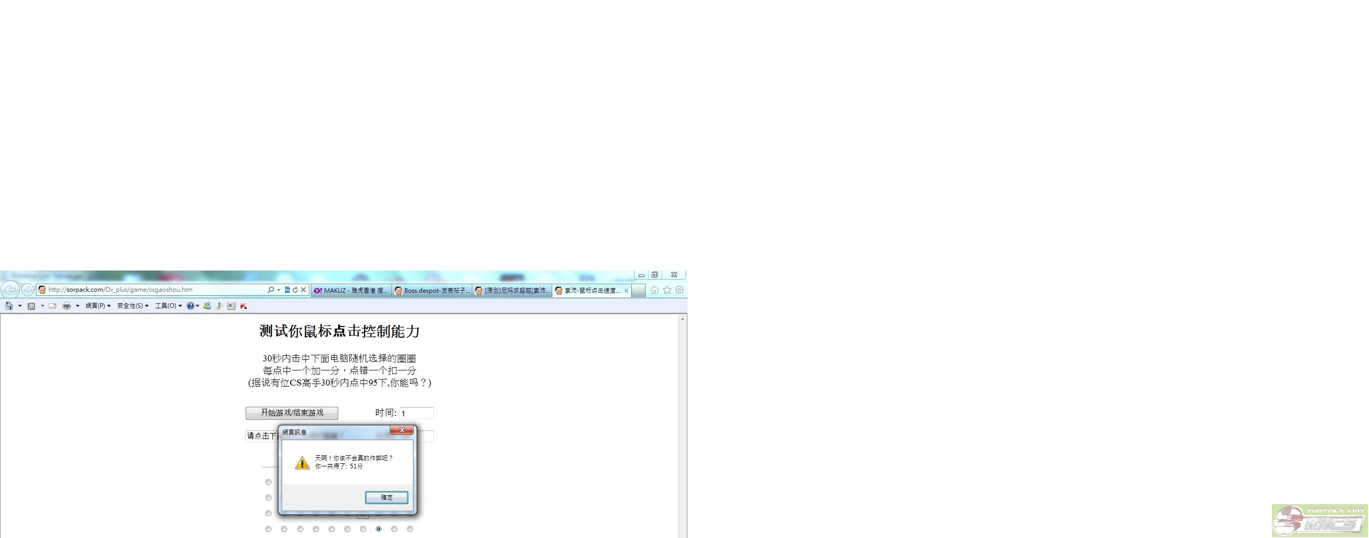 | -- 作者:a963852741 -- 发布时间:2012-03-22 20:16:00 -- 测试你鼠标点击控制能力30秒内击中下面电脑随机选择的圈圈