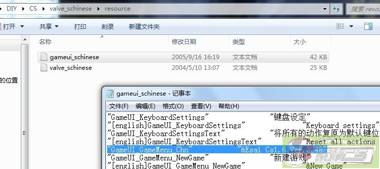 首先是2张txt,gameui_schinese.txt和valve\\cstrike_schinese,看英文部分大家也该明白,gameui是什么意思客户端UI的字典,第二张是这个MOD