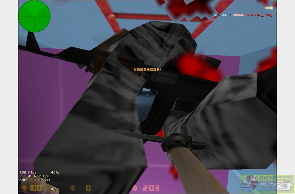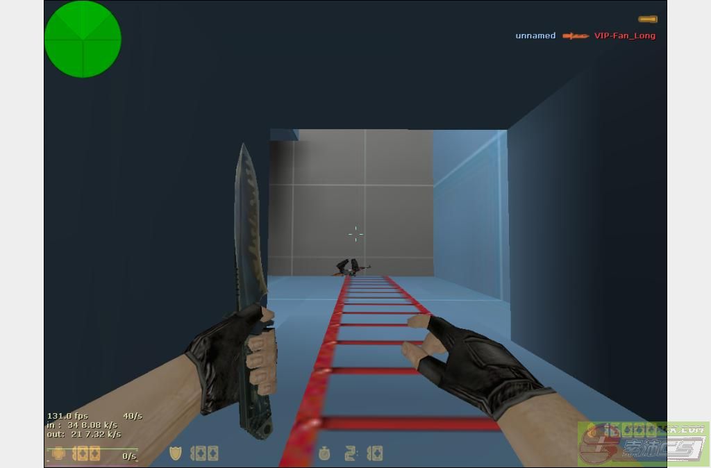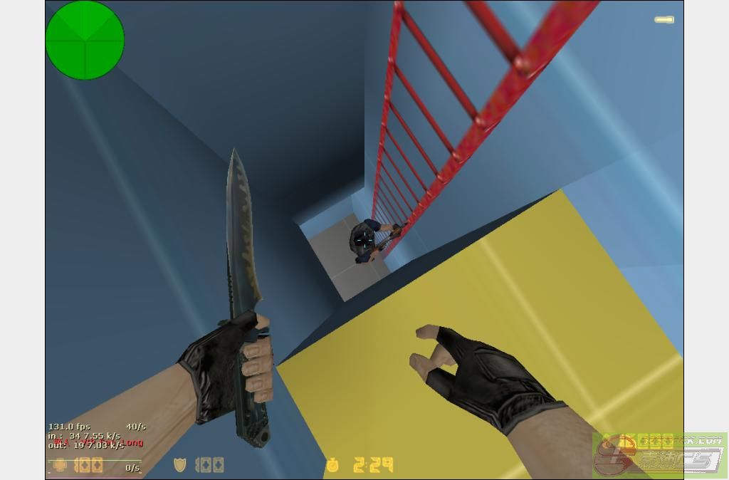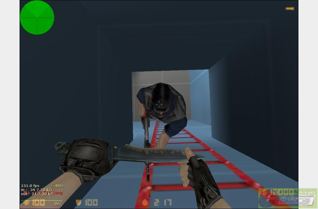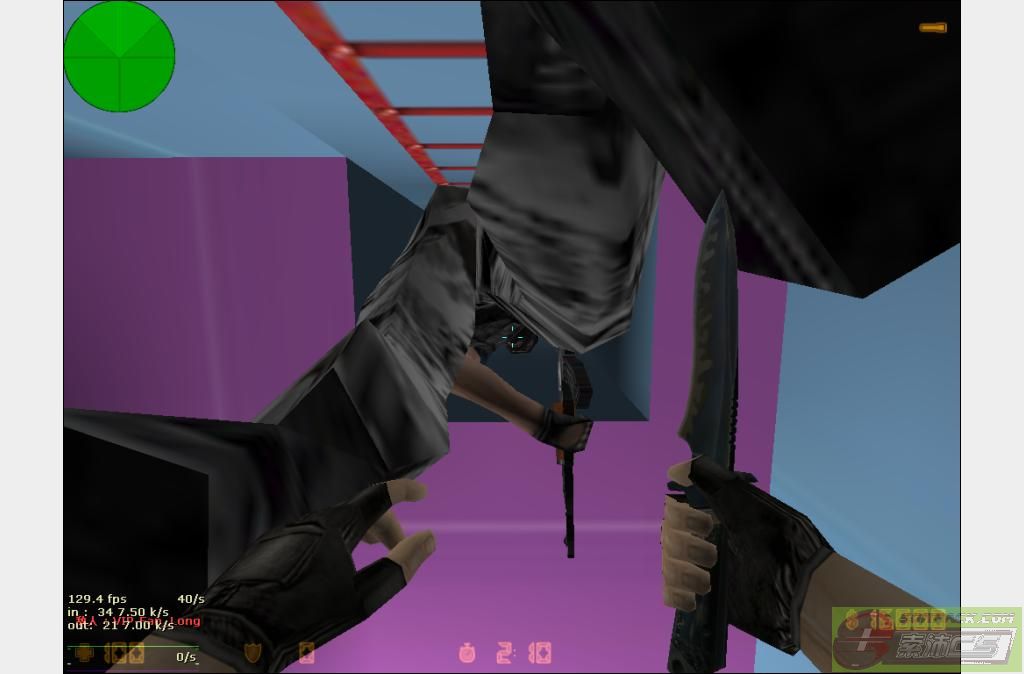 2、楼梯刺(菊花):当一个预警在梯子上不动堵着时,你在下面,你就到他下面,然后按蹲下,使距离拉到最近,然后对准预警的菊花,鼠标方向对着预警武器指的方向(不懂可以看连载图)