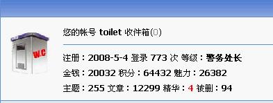 | -- 作者:toilet -- 发布时间:2008-11-18 11:27:00 -- [灌水]终于2万了,存银行了! 发帖数也第三了 [此贴子已经被作者于2008-11-18 11:30:26编辑过]