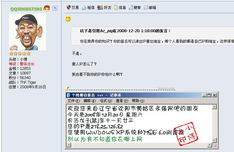 以下是引用suiyixx在2008-12-20 1:24:00的发言:娘的. 把我IP放签名.  你怎么还看不明白 我发的图呢?你真猪