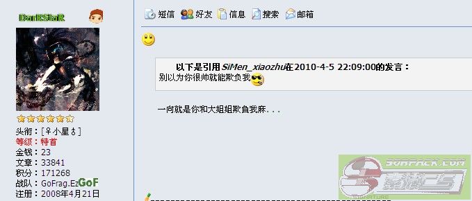 | -- 作者:sum_pig -- 发布时间:2010-04-05 22:45:00 -- 以下是引用SiMen_xiaozhu在2010-4-5 22:35:00的发言: 敢发你就死定 ![]() 我不怕死