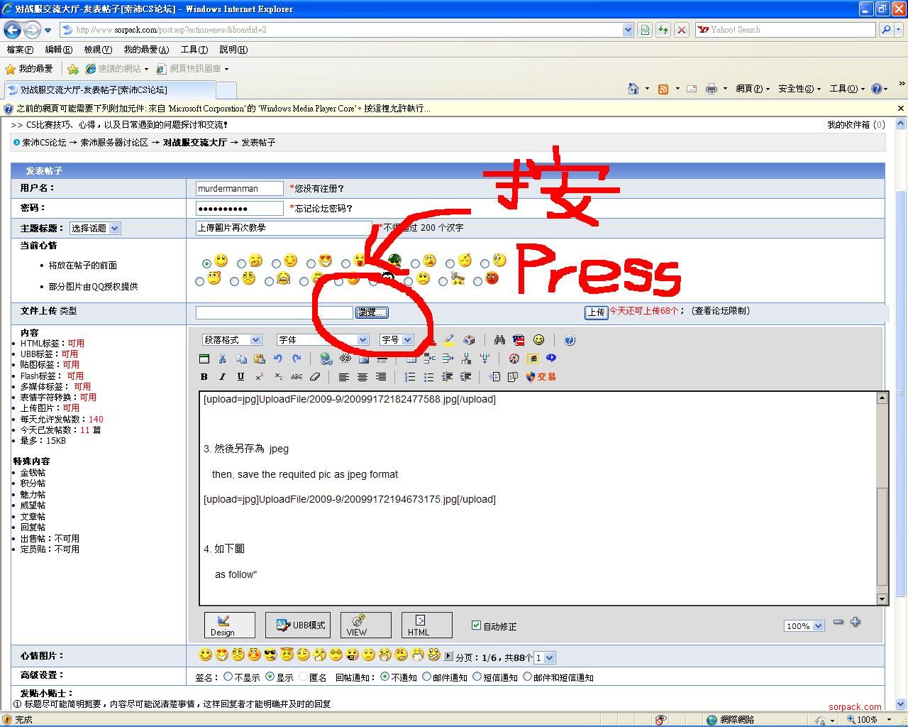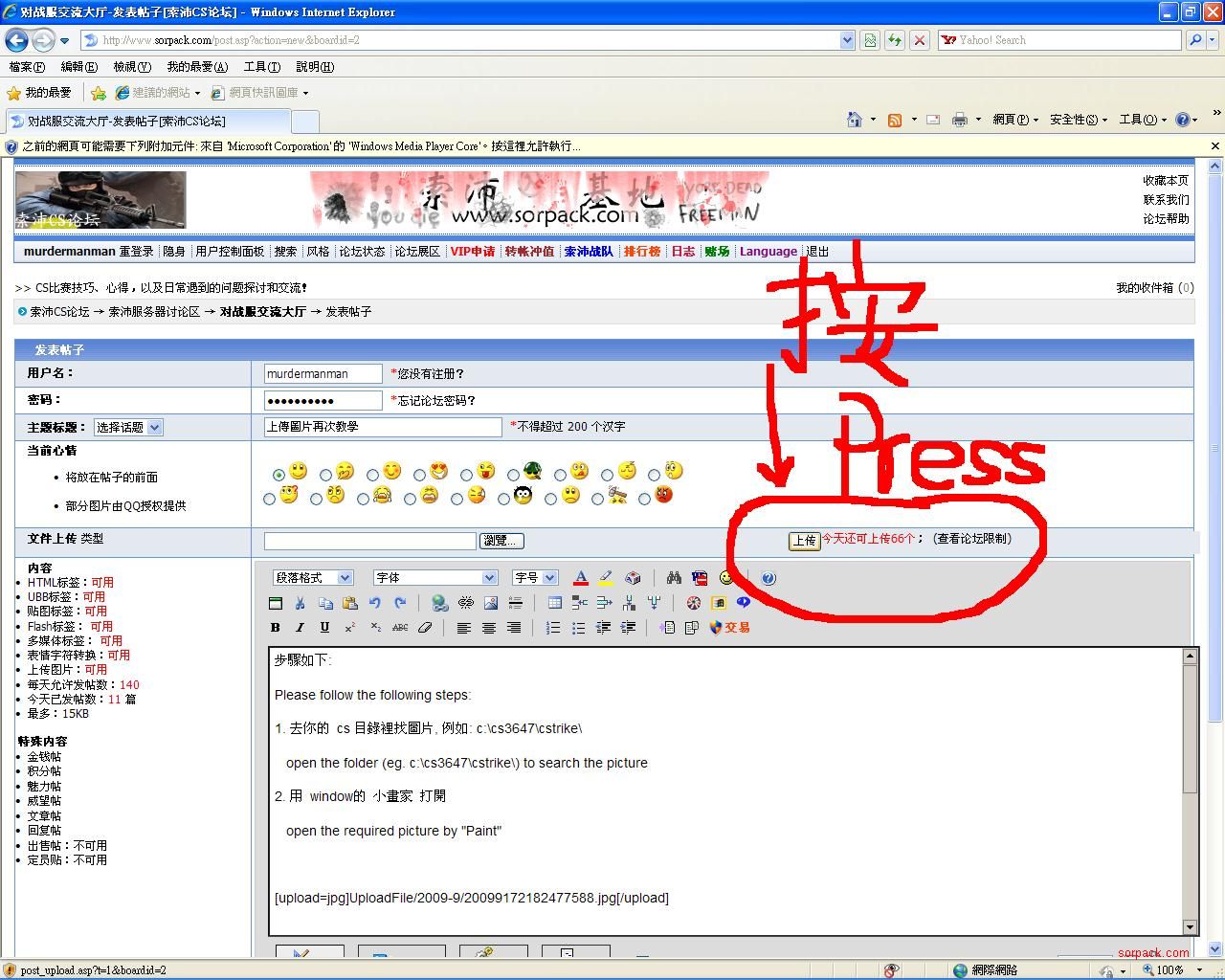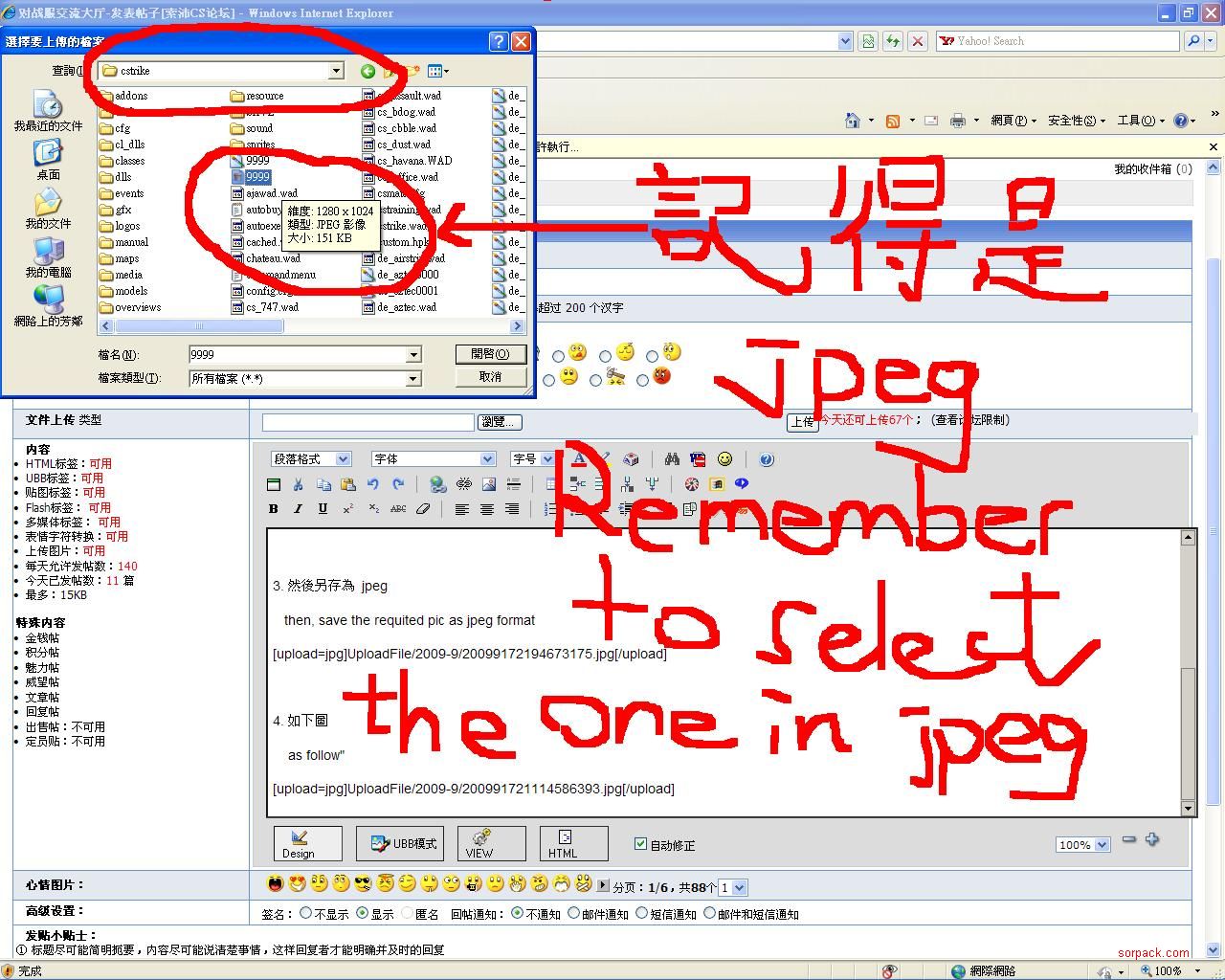 | -- 作者:murdermanman -- 发布时间:2009-09-17 21:18:00 -- 上傳圖片再次教學 步驟如下: Please follow the following steps: 1. 去你的 cs 目錄裡找圖片, 例如: c:\\cs3647\\cstrike\\ open the folder (eg. c:\\cs3647\\cstrike\\) to search the picture 2. 用 window的 小畫家 打開 open the required picture by "Paint" 3. 然後另存為 jpeg then, save the requited pic as jpeg format 4. 如下圖 as follow" 5. 再不明白, 唯有碰運氣了, 請將你的圖 email 給我, 我為你轉, 記得附上 遊戲 ID if you still have problem, please send oyur pic to me and your game ID is required Email: choimanman@yahoo.com |