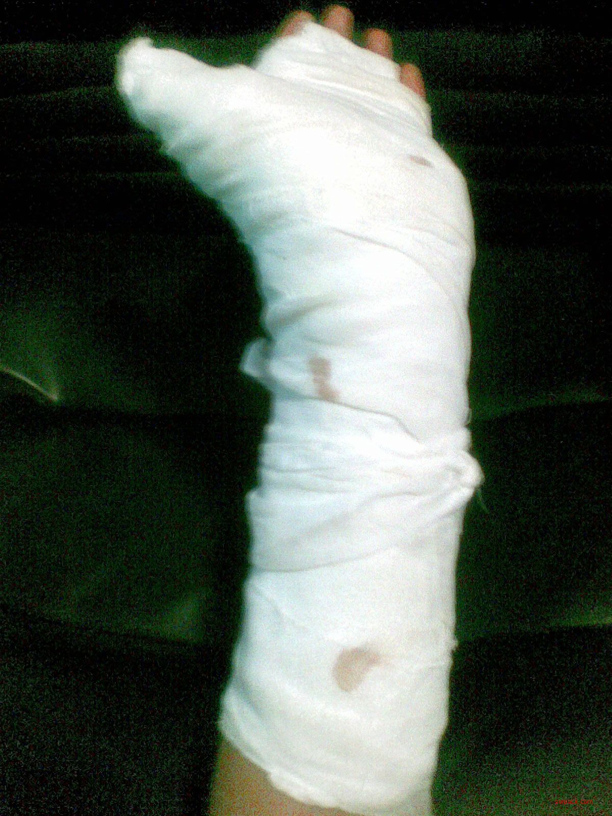 | -- 作者:liminiho -- 发布时间:2009-09-26 0:17:00 -- 望大家保护好自己 我受伤了…… 前几天出事,我手受伤了,手上肌腱被弄断了两根,手指不能活动了…… 刚做完手术,还在住院静养……要是恢复不好,估计以后这只手就…… 打了石膏,上图让大家欣赏……顺便……红包……