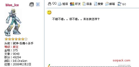 以下是引用Sticsof在2009-4-24 20:01:00的发言: 不是啊..原因有2点; 1开始我不知道GoFrag.E金钱要1000.没注意到.. 2蓝冰邀请我来冰族....我心想斑竹邀请我..证明我还算不错.. 说的话不要笑...