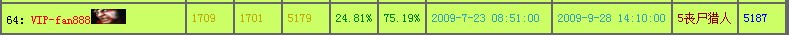 VIP-_________pig | 12309 | 3339 | 10033 | 55.09% | 44.91% | 2008-8-15 00:27:00 | 2009-9-28 14:28:00 | 1邪恶丧尸 | 19003 |
