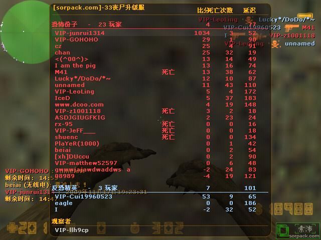 这张是剩下15分钟时的战绩,我想去T家打尸,可是没想到那尸王变态,躲家里等我。(那时我已经买了圣焰)