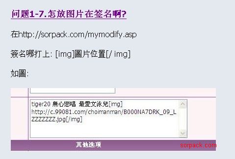 在http://sorpack.com/mymodify.asp 簽名哪打上: [img]圖片位置[/ img] 如圖: