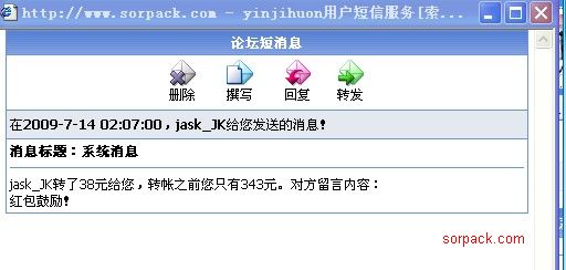 | -- 作者:yinjihuon -- 发布时间:2009-07-14 2:25:00 -- 有人发红包,你们队的去抢38的包 http://sorpack.com/dispbbs.asp?boardID=35&ID=95280&page=1, 快去啊看看18楼就知道了 此主题相关图片如下:![]() 我已经拿上了