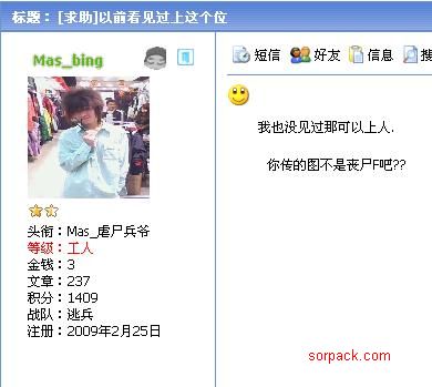 | -- 作者:Mas_Lucky -- 发布时间:2009-03-26 7:31:00 -- Brother_Hing请进..你说哪个档路的人不是我们站队的! 我就跑去站队看一下有没有这人. 结果我找了半天也找不到这人. 我就用搜索搜他..搜到后才知道他不是我们站队的! 我还看到他回贴! |
