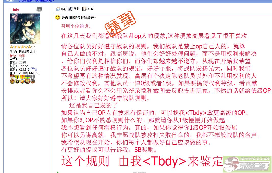 ,这个战队规则好好遵守啊,6月24号将是我回来的日子,因为是我生日,我会回来给战友们发红包,并且,我还开YY,发YY要索赔论坛的玩家来Yy唱歌,喜欢唱什么都可以,都有索币奖励,选前10位,每一位100-500sb等。希望你们可以参加。到那时候我会发帖说YY号,好好珍惜咯 好了,就说那么多了,队友们拜拜了,在游戏中我就不上了,只上论坛。 Tb,好好守这战队,等我6月回来好好看呢