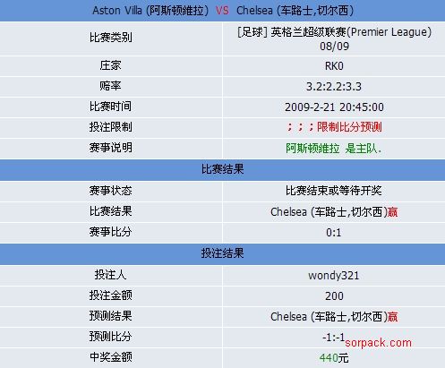 | Aston Villa (阿斯顿维拉) VS Chelsea (车路士,切尔西) | | 比赛类别 | [足球] 英格兰超级联赛(Premier League)08/09 | | 庄家 | RK0 | | 赔率 | 3.2:2.2:3.3 | | 比赛时间 | 2009-2-21 20:45:00 | | 投注限制 | ;;;限制比分预测 | | 赛事说明 | 阿斯顿维拉 是主队. | | 比赛结果 | | 赛事状态 | 比赛结束或等待开奖 | | 比赛结果 | Chelsea (车路士,切尔西)赢 | | 赛事比分 | 0:1 | | 投注结果 | | 投注人 | 50cnet | | 投注金额 | 100 | | 预测结果 | Chelsea (车路士,切尔西)赢 | | 预测比分 | -1:-1 | | 中奖金额 | 220元 |
