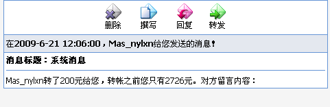 | -- 作者:Mas_nylxn -- 发布时间:2009-06-21 13:46:00 -- 我今天真是晕到家了 烦死了 我居然自己给自己转账 郁闷死了 想给自己充值呢 却给自己转了200 |