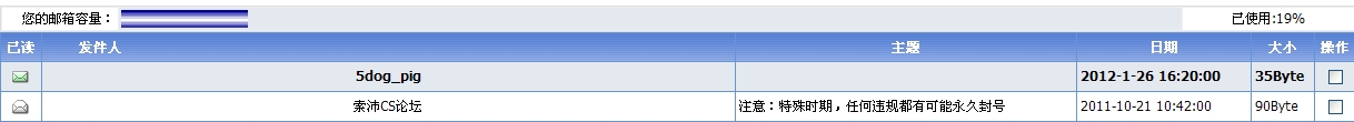 以下是引用aa2006888__love在2012-1-27 22:28:00的发言:队长说;特殊时期任何违规行为都有可能被永封. 队长多关心你,我咋就没收到呢.... 额。。 你看走眼了吧 那条是系统发的
