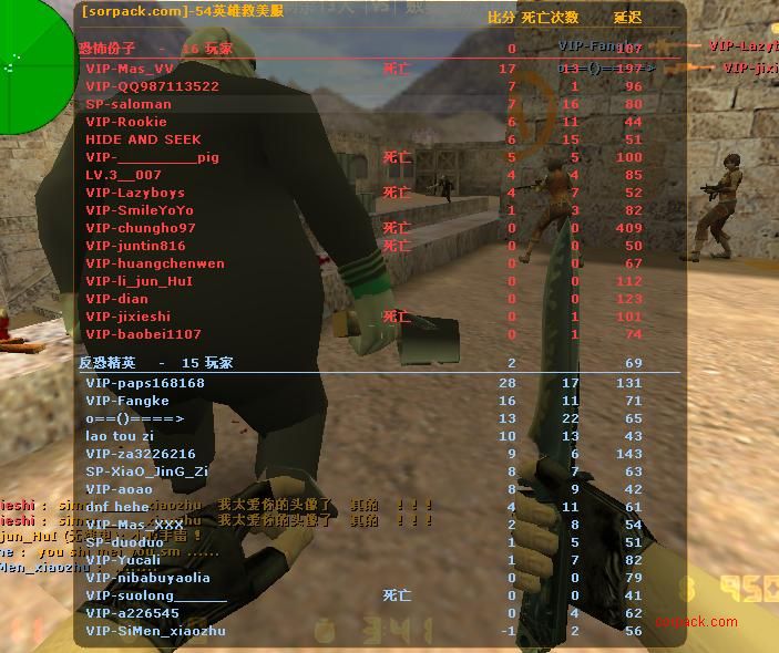 昨晚突然想到的模式:《英雄救美》,今天用了一整天时间终于写好了插件。 61.238.60.30:27024 [sorpack.com]-13英雄救美服(香港线路) 218.85.133.205:27054 [sorpack.com]-54英雄救美服(电信线路) 123.134.95.199:27018 [sorpack.com]-64丧尸吃人服(网通线路) 由于和之前大兵刺杀服相似,因此沿用大兵服升级等级(也就是说你大兵服的等级可以用于英雄救美服) 简单说一下玩法: 开局分ct和t美女两边,死亡的变成英雄(其实就是个恶心男人)。 英雄要保护好己方美女并尽量杀死对方美女。 其中一方美女死光了,那方的英雄就不能再复活了。 美女和英雄先死光的一方输。 具体大家到服里面体验一下,由于时间仓促,可能有bug,欢迎大家反馈。明天再继续完善。