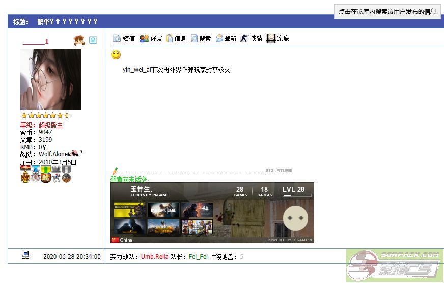 | 以文本方式查看主题 - 索沛CS1.6论坛 CS反作弊 CS1.6下载 amxx sma插件 cs对战平台 (http://go5w.com/index.asp) -- 投诉举报 (http://go5w.com/list.asp?boardid=39) ---- 二次外借账号给作弊玩家. (http://go5w.com/dispbbs.asp?boardid=39&id=2576367) |
