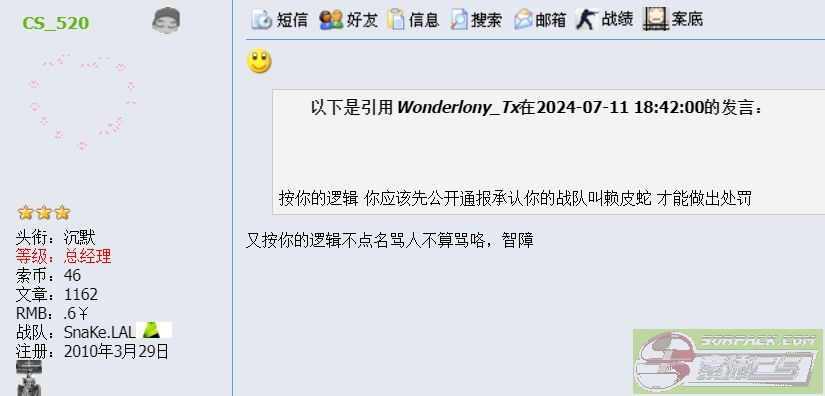 | -- 作者:Wonderlony_Tx -- 发布时间:2024-07-12 12:15:00 -- 以下是引用CS_520在2024-07-12 6:40:00的发言: 发现你这人特别爱投诉爆粗 ![]() 一查你案底爆粗被弄了两个案底 ![]() 看你号注册时间年纪应该不小了吧,像个小孩一样 ![]() 不知道这只是个游戏,别太认真,玩得开心最重要。 别双标 你的队友没有投诉吗 如果你真的好心 麻烦你先跟你队友讲一遍 不同阵营 不用在这说教 也没人听你的 你的队友你不说 出发点也是抨击别人 你的话也不中肯 不要说得自己好像老好人一样 不觉得虚伪吗 [此贴子已经被作者于2024-07-12 12:17:41编辑过]