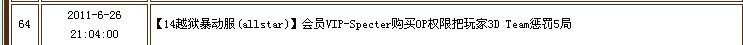 | 18 | 2011-6-26 21:04:00 | 【14越狱暴动服(allstar)】会员VIP-Specter购买OP权限把玩家3D Team惩罚5局 |
