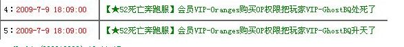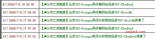 | 19:2009-7-9 18:02:00 | 【★52死亡奔跑服】会员VIP-Oranges购买解药给玩家VIP-IBenBenI | | 20:2009-7-9 17:59:00 | 【★52死亡奔跑服】会员VIP-Oranges购买解药给玩家VIP-GhostBQ | | 21:2009-7-9 17:58:00 | 【★52死亡奔跑服】会员VIP-Oranges购买OP权限把玩家VIP-GhostBQ弄晕了 | | 22:2009-7-9 17:57:00 | 【★52死亡奔跑服】会员VIP-Oranges购买解药给玩家VIP-IBenBenI | | 23:2009-7-9 17:57:00 | 【★52死亡奔跑服】会员VIP-Oranges购买OP权限把玩家VIP-IBenBenI弄晕了 | 这是在第2局开始之后,我说论坛见后,他才购买解药给我的