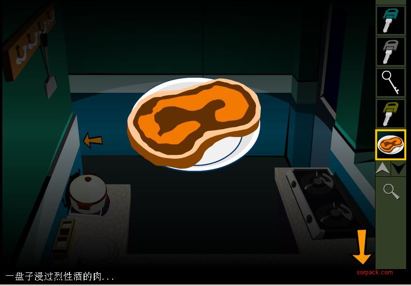 再往右走来到厨房会发现后面有人把琐弄坏了 你出不去了 这里有些盘子有些酒 拿走 这里有个窗户 可是根本出不去 外面有狗 可看到 这里有个狗盆子 用途 装肉、 把狗迷醉 制作酒肉的过程 先点盘子 再点放大镜 把盘子放大后 点中肉 再点盘子 就可以把肉放盘子里 再点酒再点盘子就可把酒放到肉里了 如图 点窗户来到外面 点肉 把肉放到这个狗盆里