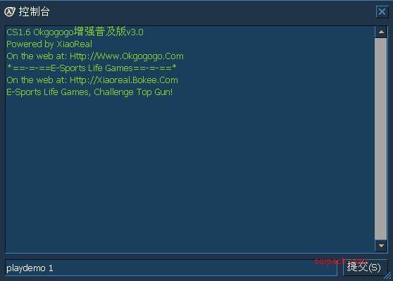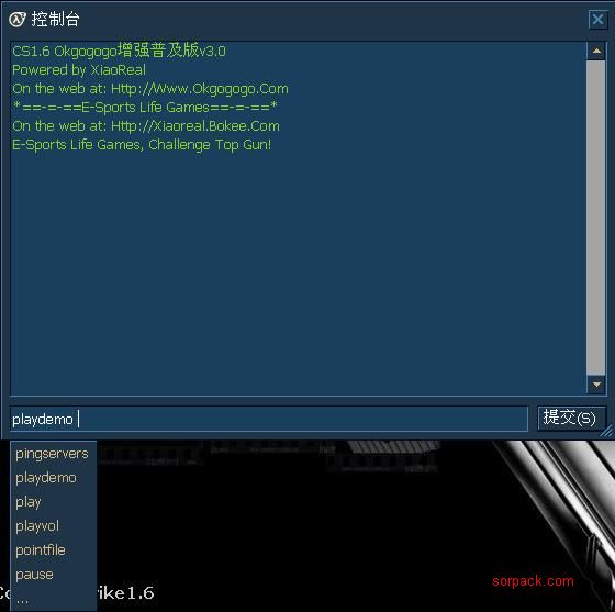 进入CS后按`键进入控制台 按照DEMO文件的文件名输入文件名 比如playdemo 1.输入完成后按回车键等上三秒时间就会自动播放了. 关于录制的方法我以前有发过帖,大家可以去那帖看看. http://www.sorpack.com/dispbbs.asp?BoardID=44&ID=92972&replyID=&skin=1 如还有不懂的可以回帖问我,只要是我知道的一定会帮助你们解决. [此贴子已经被作者于2009-8-26 22:20:20编辑过]