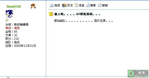 | -- 作者:SeanYs9 -- 发布时间:2010-01-10 11:05:00 -- 小宝11111。。。SOS 昨天我在这里发了个加战队的帖。你们一版主就说我灌水了。 什么道理嘛?不就是叫AY帮我顶顶。这也叫灌水? yinjihuon这版主说说理由。我不服。 |