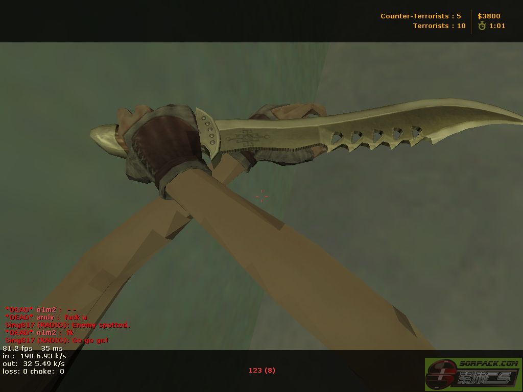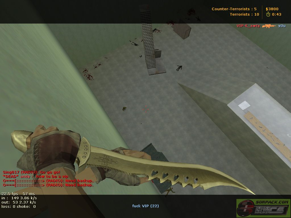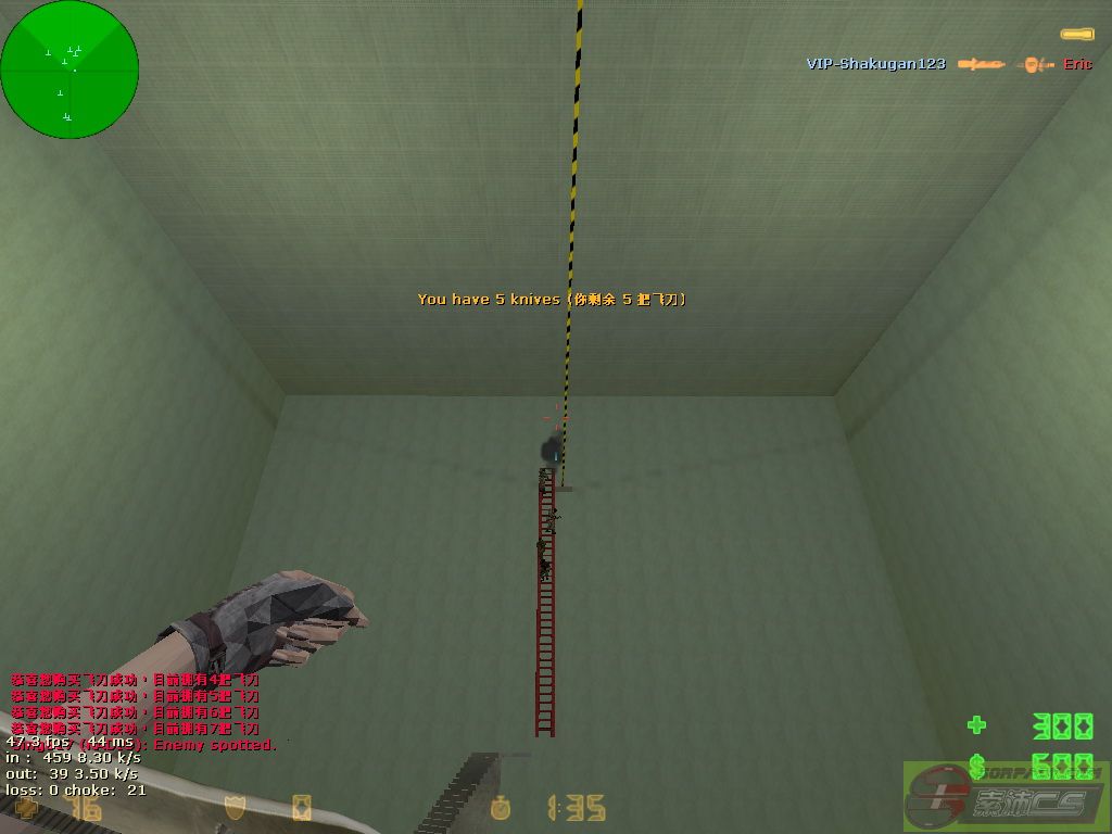 119.246.159.146:27018 Ans: [更新]81功夫飛刀服IP 121.12.174.219:27022 [sorpack.com]-81功夫飞刀服 Q2. 如何使用飛刀功能啊? 飛刀Ans: 轉換成刀(默認鍵:3),按MOUSE1(左鍵)/開火飛出飛刀 腳踢Ans: 轉換成刀(默認鍵:3),按MOUSE2(右鍵)/特殊使用腳踢 Q3. 飛刀與腳踢的傷害是多少? 飛刀Ans: 1飛刀=20HP 腳踢Ans: 1腳踢=10HP [近身/後襲可以扣75HP] Q4. 飛刀怎樣才算飛中敵人? Ans: 飛中敵人特徵(1.頭部出黑煙 2.頭部突然向下) Q5. 腳踢怎樣打法啊? Ans: 只要與敵人接近/敵人在你身旁 使用腳踢即可踢飛/踢死/踢開 還可以把持槍的敵人打走手上的槍 Q6. 飛刀怎分敵我? Ans: T的飛刀為粉紅色 CT的飛刀為藍色 Q7. 怎樣買飛刀? Ans: 按(,)即可買飛刀1把 1把=800$ Q8. 如果有VIP作弊該怎辦? Ans: 錄製Demo後去投訴區發帖連同Demo放上 DEMO錄製方法: 控制台輸入record 1 (record是錄demo指令, 1是檔案的名稱) 錄好了輸入:stop (停止錄製) 錄好了的demo在 CS1.6\\cstrike_schinese 或 CS1.6\\cstrike,名稱是: 1.dem 播放demo: 把demo放在CS1.6\\cstrike. 再到控制台輸入 playdemo 1 (playdemo是播放demo指令,1是檔案名稱) 若果上傳不成功 可以上傳到 Q9. 飛刀服裹OP怎使用啊? Ans: (要加入索沛戰隊)先說/buyop後 然後選擇懲罰方式後 選擇被罰者即可OP 詳細到:★【功夫飛刀】遊戲規則 OP使用方法 http://sorpack.com/dispbbs.asp?boardID=48&ID=145272&page=1 Q10. 我想改飛刀的模型,該怎換? Ans: 在 你的CS文件/cstrike_schinese(中文版)or cstrike_tchinese(英文版)/models找出v_kungfu.mdl,把更換的mdl取代 Q11. 有什麼好的飛刀教學? Ans: 在飛刀大廳版主名單的右邊選擇 精华 可以查看部分精華教學帖 Q12. 飛出的飛刀可檢嗎? Ans: 可以,飛刀飛出來的是單刀[拾獲飛刀會顯示身上的飛刀] 人死後會掉飛刀包[敵人死前的身上刀子數] Q13. 為什麼我拾了飛刀包可是沒有飛刀? Ans: 因為系統有時敵人飛光刀後被殺會掉下 空包 所以沒有飛刀 Q14. 為什麼飛刀服有時會掉線/關了? Ans: 因為可能是地圖問題 等1分鐘伺服將會重開 Q15. CS裝不了飛刀服地圖 在那可以下載地圖啊? Ans: 可能你的CS有點xx了 飛刀現有地圖下載為以下網址 http://sorpack.com/dispbbs.asp?BoardID=48&ID=147992&replyID=&skin=0 Q16. 看到別人如何飛上槍房/機關啊? Ans: 這是Bug, 相關教學可到以下網址 http://sorpack.com/dispbbs.asp?BoardID=48&ID=147367&replyID=&skin=0 Q17. 有個飛刀地圖的超級跳器,如何使用啊? Ans: 向前+跳+蹲即可使用 相關用法可到以下網址 http://sorpack.com/dispbbs.asp?BoardID=48&ID=144524&replyID=&skin=0 Q18. 如何開車啊? Ans: 在車上按(e)後 按W向前 按S向後 按A向左 按D向右 Q19. 如何避開人家的飛刀啊? Ans: 由一飛出就要確定飛刀線路,然後用A/D鍵躲開 Q20. 為什麼有時在某地圖上打不死敵人啊?[dao_911] Ans: 因為那名敵人在機器加了千,萬多血,不能打死 可以推他下超級毒水. 詳細可到以下帖子鏈結 http://sorpack.com/dispbbs.asp?BoardID=48&ID=147367&replyID=&skin=0 Q21. 戰績要多少才有獎勵? Ans: 殺50死10以下40SB 殺60以上死10以下50SB 不能戰績分加在一起計 Q22. 戰績圖上傳那去拿獎勵? Ans: 把戰績上傳到頂帖的獎勵帖 自行開帖可能被處分 Q23. 如何拿槍啊? Ans: 通過機關(頭上的一條柱)然後到達平台開啟正確的機關送出車乘上後會進去槍房 Q24. 如何開樓梯? Ans: 跟開車一樣,按E [W前,S後,A左,D右] Q25. 如何準備飛中敵人啊? Ans: 在乎你的飛刀,判斷技術 Q26. 飛刀版版歌是什麼? Ans: 如果開貼問的話扣錢 可以按版歌裹面看看有沒,沒有的自己找 |
