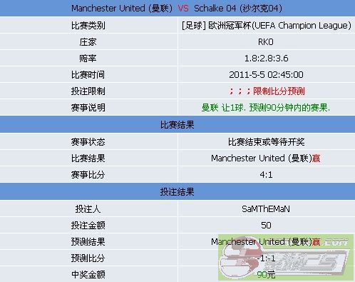 以下是引用COOL_SONIA在2011-5-5 14:51:00的发言:good lucky!~  not lucky , man utd 2 - 0 in away , so Shalke have to score 3 goals to win , but they lost in their own ground , so they cannot win in man utd ground .... if i had more money i would bet it all -.-