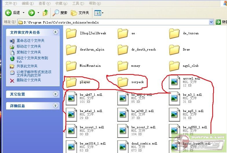 一般的外國遊戲都喜歡用MOD(模型)來創造遊戲的主題,從TDU1、GTA4、NFS系列再到CS1.6,都是運用了模型作為主題下面列出CS所有模型文件的地址。另外2樓列出索沛所有模型地址,請各位不要再2樓前回覆 先來講模型把。很多人都不會裝,其實換模型是最簡單不過的事情的,比如你想換的模型是XXX.mdl,代替他的模型叫YYY.mdl(注:mdl是CS的模型名字)那你就把YYY.mdl重命名為XXX.mdl然後放在原XXX的目錄中替換。不過先要備份的喔~~不然有錯誤的BUG你還可以重新替換回來 下圖是CS文件夾的解析。紅圈為CS模型有關文件夾,沒紅圈的請不要手賤去修改