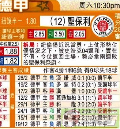我快你一步 除非下半場追返3球- 但睇下紐倫堡近3次主場都係0失球 再睇下聖保利近2仗0入球 就大約知賽果啦 [此贴子已经被作者于2011-3-5 23:41:12编辑过]