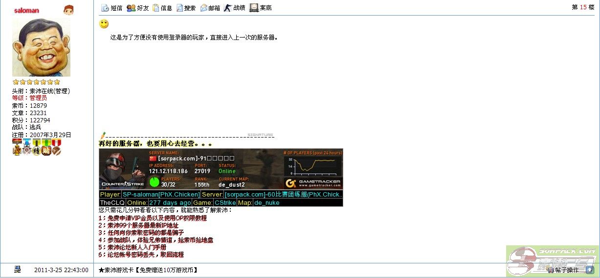 | -- 作者:YFai -- 发布时间:2011-03-25 23:50:00 -- 或許這樣做可以方便玩家 但是有些玩家不樂意!? 這是CS , 不是一個單純的登入器程序 ========================== 有些玩家很喜歡這類快捷:http://www.sorpack.com/dispbbs.asp?boardID=40&ID=648088&page=4 但並不代表全部人喜歡:http://www.sorpack.com/dispbbs.asp?boardID=79&ID=649473&page=1 甚至有人說這是流氓插件:http://www.sorpack.com/dispbbs.asp?boardID=2&ID=648116&page=1 未經過允許而擅自修改 ========================== 對 這是很好很方便 我誠懇希望老大能把時間放進反作弊中 [此贴子已经被作者于2011-3-26 13:55:32编辑过]