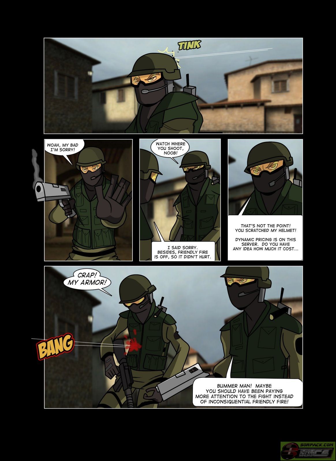 | -- 作者:BUGS -- 发布时间:2011-06-16 12:05:00 -- CS funny comic...(of Chinese) 标题:CS搞笑漫画 内容:tink 叮叮 woah, my bad. I\'m soory! 哇!我打错人了。对不起 watch where you shoot noob!看看你,往哪里打啊?菜鸟 I said sorry. besides, 我已经说过对不起了,而且 friendly flre is off, 队友伤害是关闭的,所以 so it didn\'t hurt. 不会痛的 ![]() that\'s not the point! 这还不是重点哈, you scratched my helmet! 你还弄坏了我的防弹头盔!! dynamic pricing is on this server. 在这个服务器是动态定价(这个我不会翻译,搜索引擎也没找到) do you have any idea how mush it cost... 你有什么想法?要不要赔给我?很贵的饿 等下在翻译了,吃饭先 |
