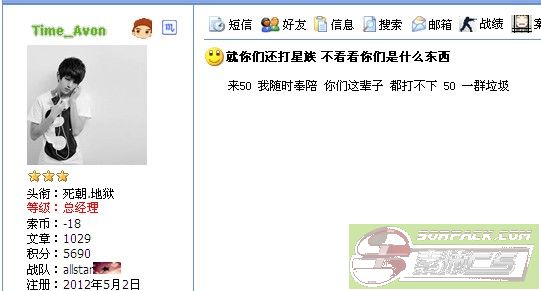 | -- 作者:Gold_quan -- 发布时间:2012-07-12 22:51:00 -- 建议星族T掉这人! 这人很喜欢挑拨两队间的关系,尤其是在两队间开始打仗的时候去挑拨 他的大号是Time_silme 上次黄金和玄武正在激烈打仗的时候,他直接去玄武版块用黄金的名义发了个骂人帖,和这贴的内容差不多。 这人还有个特点是:自大,TMD比小伟都自大,我真是无语,每次在游戏里说:你们这些小喽啰,敢和老子打?老子一人顶3