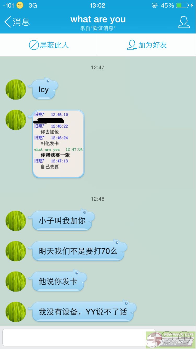 | -- 作者:lisoRICH -- 发布时间:2015-07-31 21:51:00 -- 大魔鬼就是牛逼还有汉奸来收消息 真是会玩 在kz群打听明天打哪 我TM打哪关你卵事啊 还听小子说有人发卡 傻逼似的 魔鬼不是有卡发吗 还来这要卡? 长点b脸吧 据打探 此人魔鬼群的群名备注为FeiJ 谢谢队友们在群里发的图 [此贴子已经被作者于2015-7-31 22:01:29编辑过]