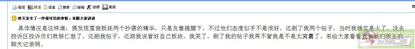 我笑啦,我发的帖子很低调,态度很明确,你是抄袭,只是友情提示下版主,迎来的是什么???