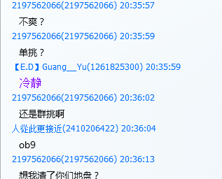 以上谈话发生在今天末日的qq群里,说话的qq2197562066说自己盟军的,要清末日的地盘,对末日副队guan_yu的劝告也完全无视,后来他又说自己是盟军的副队小杰,够厉害吧!