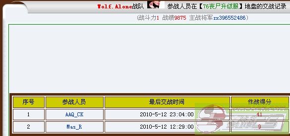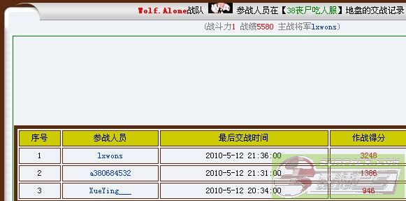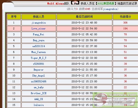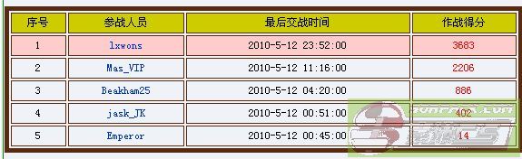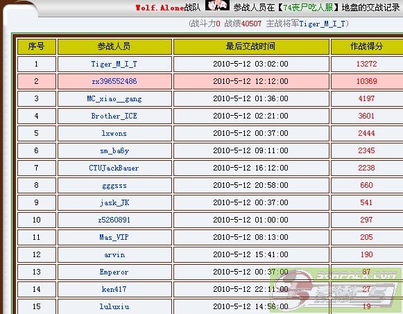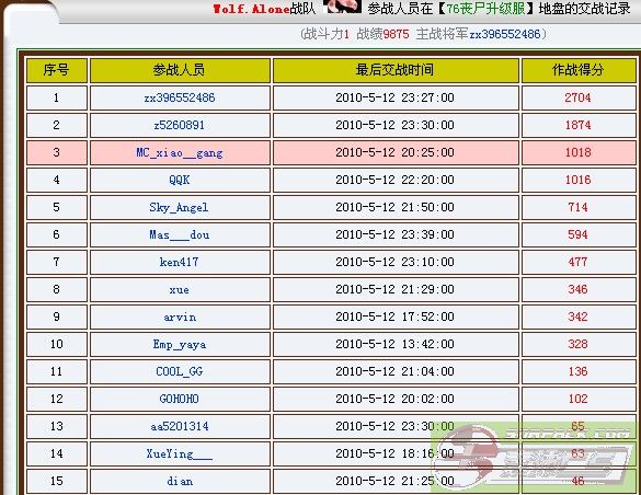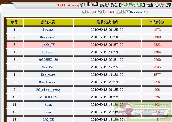 2010.05.11 服务器 总战绩 守服将军 总收入 01服吃人服 序号 参战人员 最后交战时间 作战得分 1 lxwons 2010-5-11 12:06:00 2600 2 Mas_VIP 2010-5-11 10:43:00 2042 3 Beakham25 2010-5-11 07:42:00 700 4 jask_JK 2010-5-11 01:23:00 270 5 XueYing___ 2010-5-11 18:19:00 179 lxwons 38服吃人服 序号 参战人员 最后交战时间 作战得分 1 lxwons 2010-5-11 23:16:00 2867 2 a380684532 2010-5-11 21:23:00 531 lxwons 74服吃人服 1 Tiger_M_I_T 2010-5-11 03:54:00 18021 2 Brother_ICE 2010-5-11 23:38:00 8707 3 Lucky_Star 2010-5-11 03:38:00 3847 4 jask_JK 2010-5-11 02:26:00 2493 5 zx396552486 2010-5-11 03:44:00 2016 6 sm_ba6y 2010-5-11 02:31:00 1553 7 aa5201314 2010-5-11 23:04:00 1311 8 SanDy_ 2010-5-11 07:14:00 569 9 AAQ_CK 2010-5-11 22:21:00 488 10 MC_xiao__gang 2010-5-11 04:30:00 389 Tiger_M_I_T 75服吃人服 序号 参战人员 最后交战时间 作战得分 1 a134088369 2010-5-11 23:49:00 9295 2 mas_meng 2010-5-11 15:16:00 4961 3 b134088369 2010-5-11 23:50:00 2920 4 Beakham25 2010-5-11 03:24:00 2789 5 jask_JK 2010-5-11 14:47:00 2166 6 luluxiu 2010-5-11 20:01:00 2016 7 Mas_Enc 2010-5-11 14:49:00 1605 8 lds132 2010-5-11 13:23:00 1320 9 Emp_yaya 2010-5-11 12:17:00 870 10 xue 2010-5-11 21:13:00 815 11 lxwons 2010-5-11 00:34:00 302 12 Emperor 2010-5-11 00:31:00 72 a134088369 76服升级服 序号 参战人员 最后交战时间 作战得分 1 zx396552486 2010-5-11 23:49:00 2816 2 Sky_Angel 2010-5-11 23:49:00 2160 3 bg4sqn 2010-5-11 20:47:00 1571 4 QQK 2010-5-11 22:30:00 1195 5 z5260891 2010-5-11 23:49:00 1168 6 MC_xiao__gang 2010-5-11 21:13:00 896 7 SanDy_ 2010-5-11 19:45:00 515 8 Mas___dou 2010-5-11 13:40:00 431 9 XueYing___ 2010-5-11 19:33:00 352 10 Emp_yaya 2010-5-11 12:53:00 253 11 xue 2010-5-11 19:21:00 222 12 jiangzubin 2010-5-11 12:43:00 118 13 ken417 2010-5-11 22:38:00 89 14 dian 2010-5-11 21:48:00 66 15 COOL_GG 2010-5-11 19:15:00 57 1 a134088369 2010-5-11 17:29:00 38 2 AAQ_CK 2010-5-11 21:24:00 31 3 lds132 2010-5-11 17:14:00 19 4 arvin 2010-5-11 14:27:00 5 zx396552486