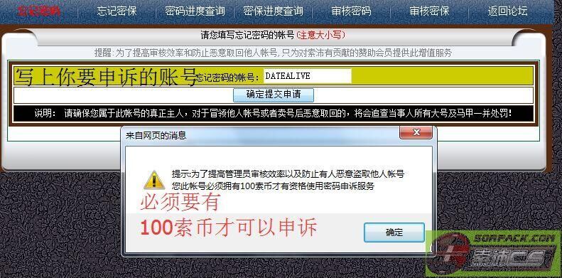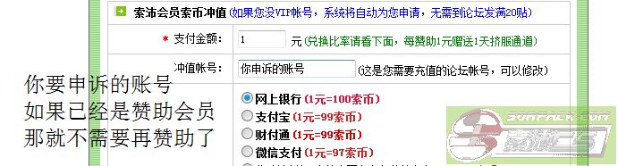 一定要有100索币才可以申诉,如果没有的话请到以下网址赞助一块钱,或者自己想办法借