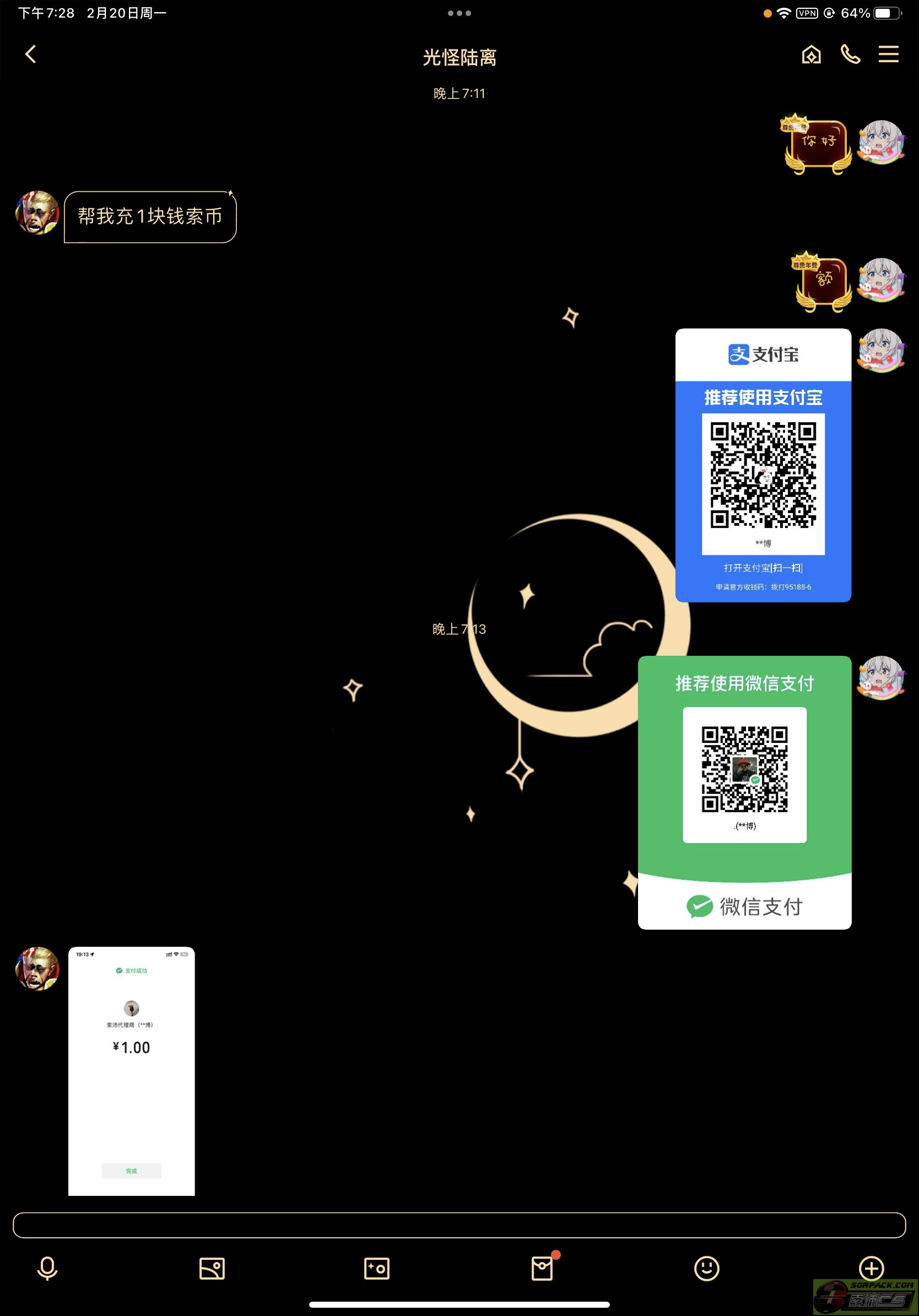 赞助索沛(1元=100索币)