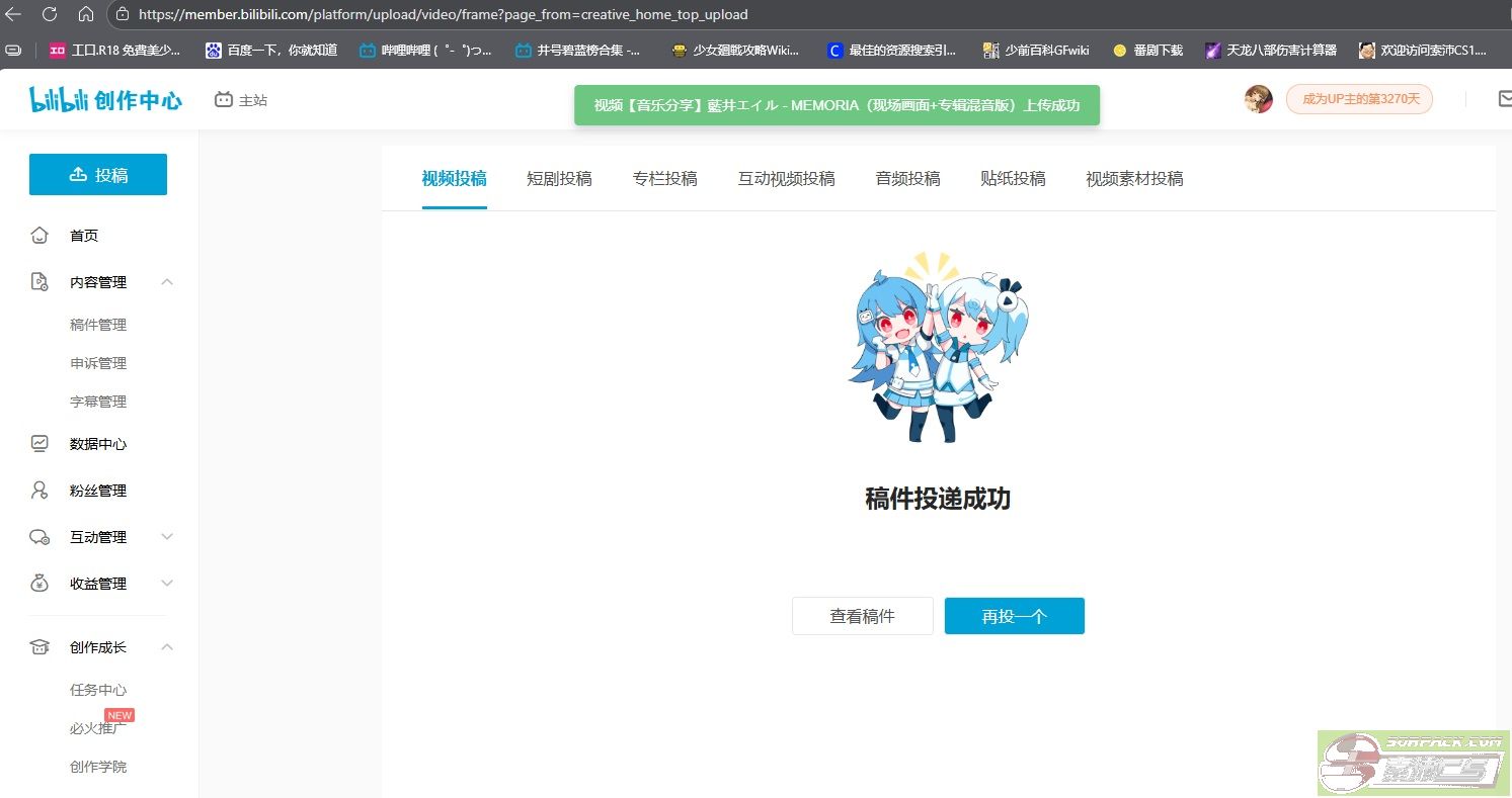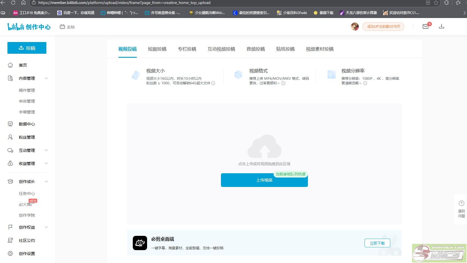 4、跳转页面后,默认上传内容类型是视频,现在就可以拖拽文件夹中的视频或者点击“上传视频”按钮,将自己的视频上传至B站服务器。(如下图)