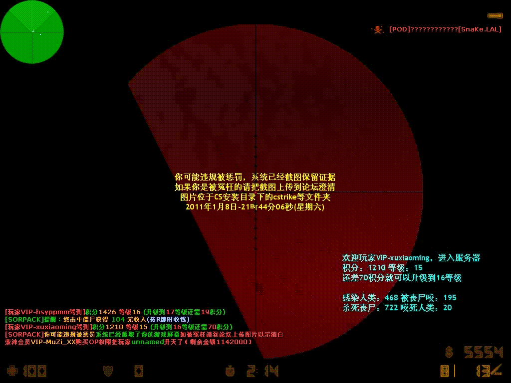172011-1-8 21:44:00【76丧尸升级服(Wolf.Alone)】会员VIP-MuZi_XX购买OP权限把玩家unnamed***了