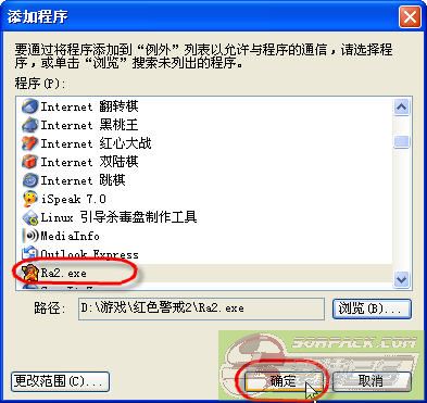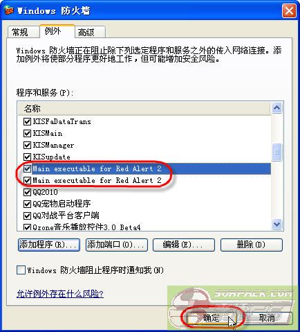 第一次启动游戏时,必须解除Windows防火墙的阻止。如果错过了,也可以进入控制面板-Windows防火墙-例外-里面把红警可执行文件添加进去。