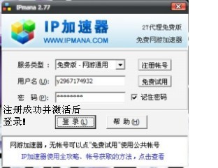 登录代理:请先在注册地址注册一个帐号并在官网,帐号管理界面激活,五分钟后即可免费使用,7天激活期完后可以再次激活完全免费!之后在登录界面输入帐号登录即可;