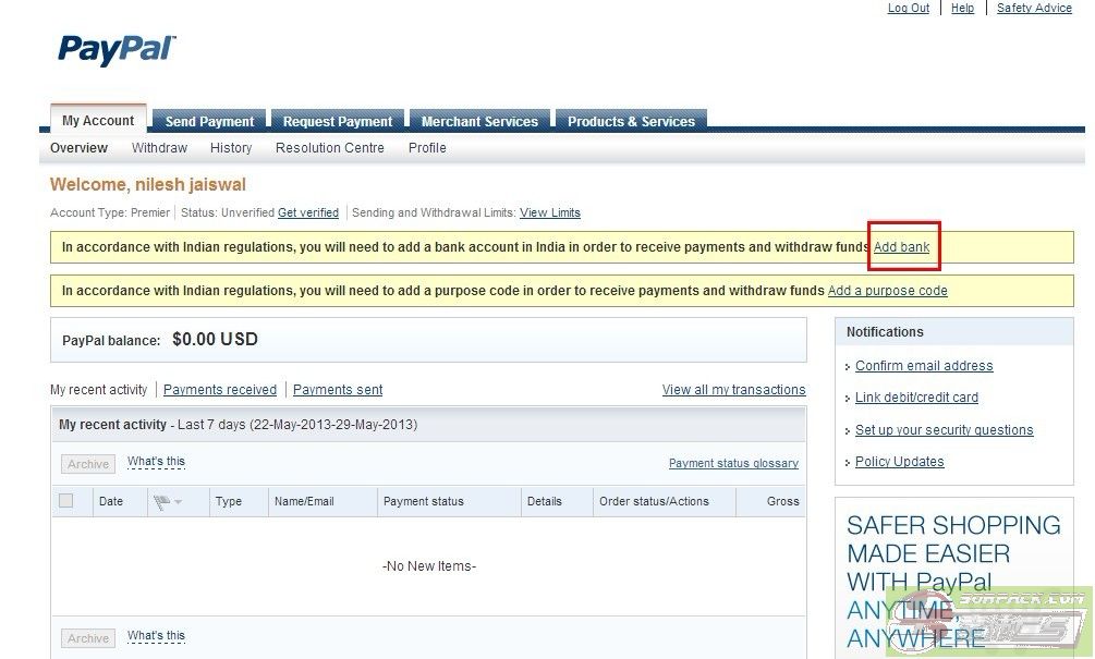 NOTA: Ini adalah pilihan. Anda boleh menambah kad bank anda selepas itu juga (PAYPAL mengenakan jumlah yang kecil untuk mengesahkan kad anda. Ia bayaran balik jumlah selepas 2 hari apabila ia telah disahkan ia.)