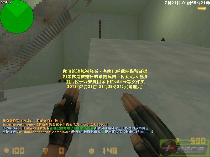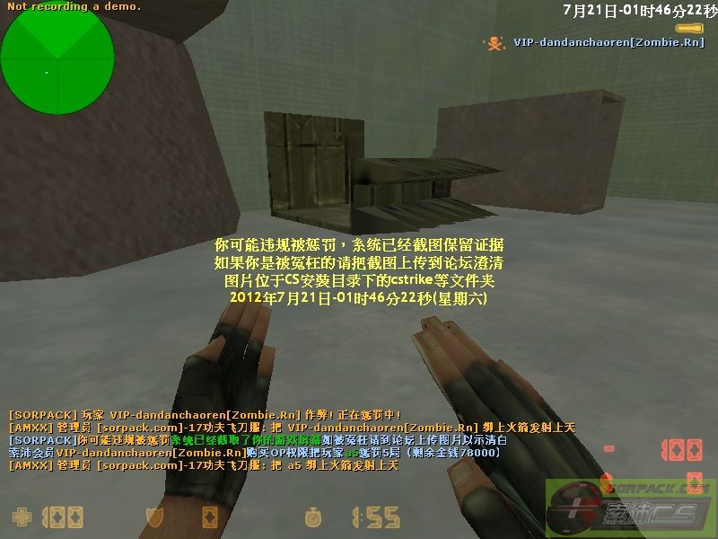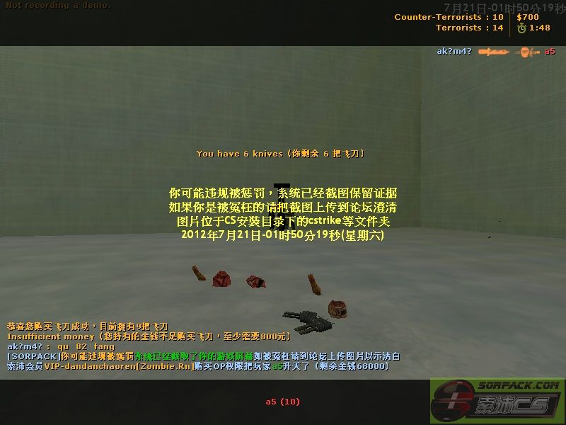 | 2 | 2012-7-21 1:46:00 | 【17功夫飞刀服(Pro.Knife)】会员VIP-dandanchaoren[Zombie.Rn]购买OP权限把玩家a5惩罚5局 |