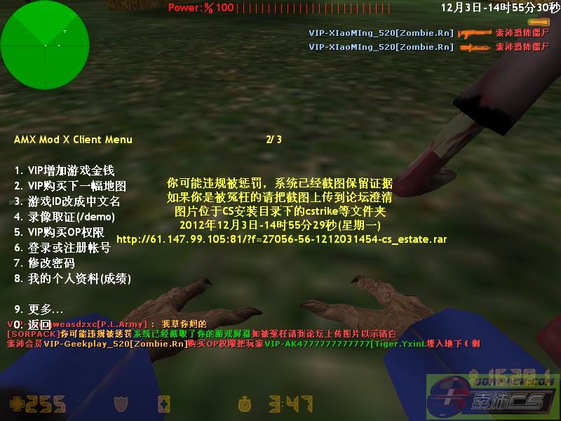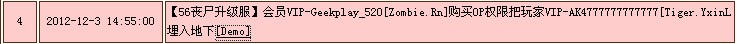 102012-12-3 14:55:00【56丧尸升级服】会员VIP-Geekplay_520[Zombie.Rn]购买OP权限把玩家VIP-AK4777777777777[Tiger.YxinL埋入地下[Demo]