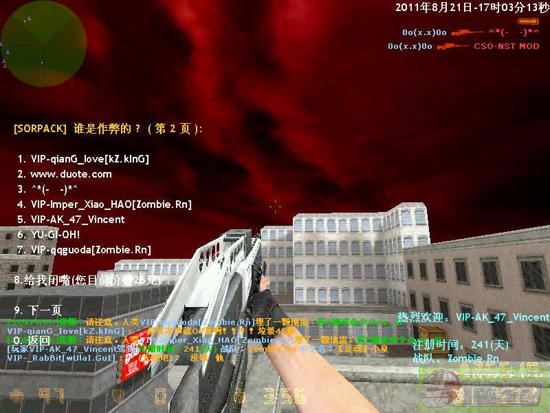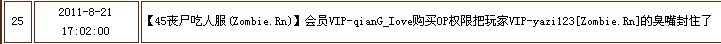 | 33 | 2011-8-21 17:02:00 | 【45丧尸吃人服(Zombie.Rn)】会员VIP-qianG_Iove购买OP权限把玩家VIP-yazi123[Zombie.Rn]的臭嘴封住了 |